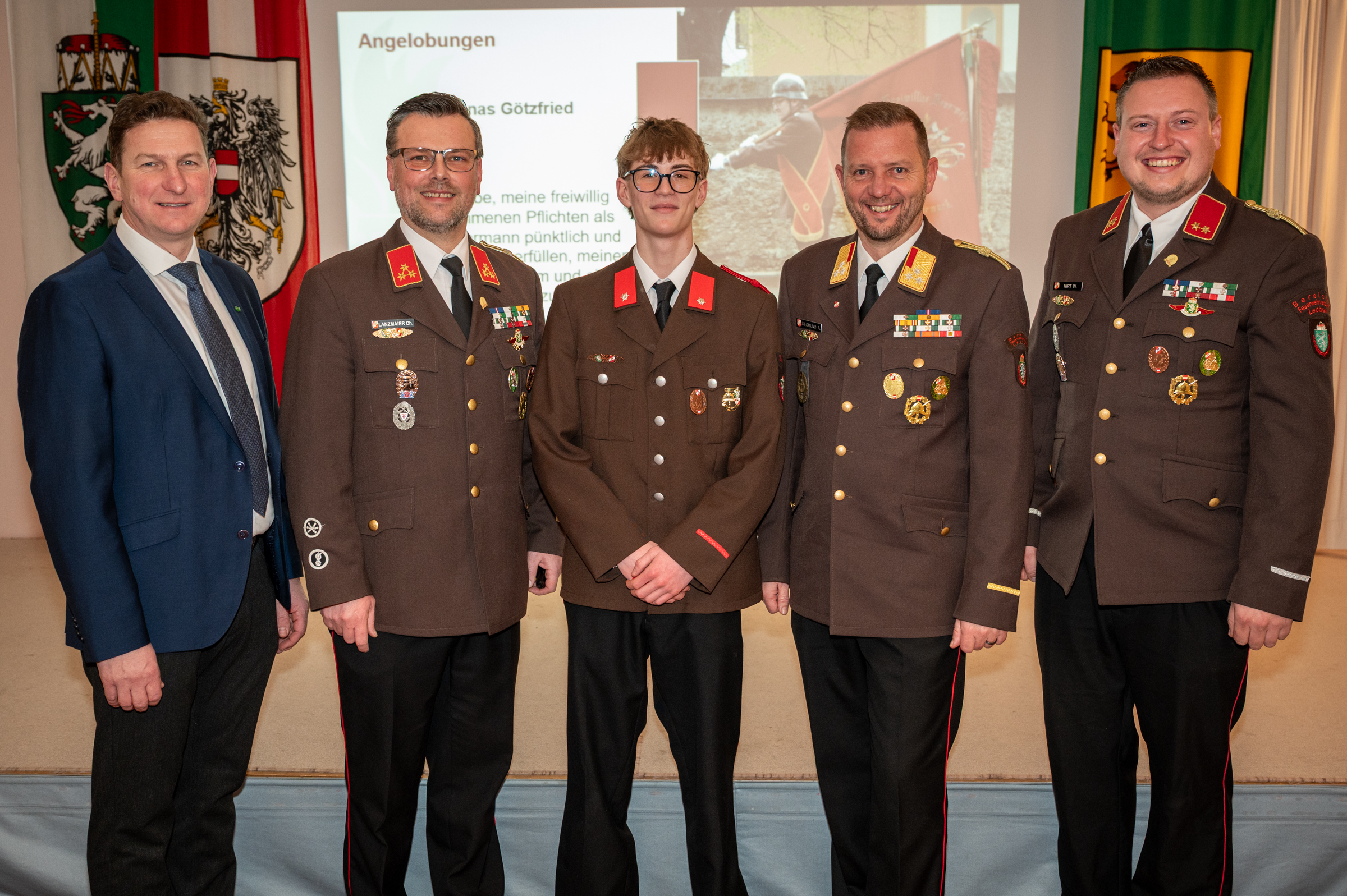 Weiters konnte Jonas Götzfried zum Feuerwehrmann angelobt und in den Aktivstand überstellt werden. Leitner Manuel wurde zum Beauftragten für Ausbildung bei Bewerben und Leistungsprüfungen ernannt, Koll Florian übernahm die Funktion des Funkwartes, beide wurden zum Löschmeister des Fachdienstes befördert.